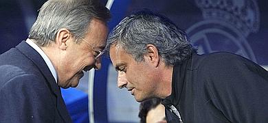 MD51. MADRID, 26/11/2011.- El presidente del Real Madrid, Florentino Pérez (i), saluda al técnico portugués José Mourinho (d), momentos antes del partido de la decimocuarta jornada de Liga de Primera División, que el conjunto blanco disputa ante el Atlético de Madrid esta tarde en el estadio Santiago Bernabéu. EFE/Juan Carlos Hidalgo TELETIPOS_CORREO:DEP,DEP,%%%,%%%