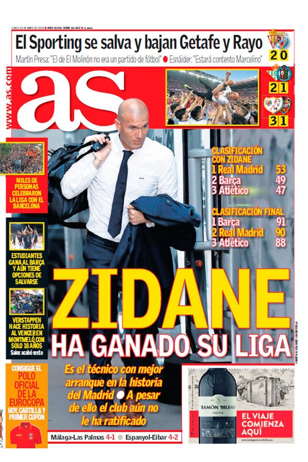 Pues bien, lo que hacen ellos es exactamente lo mismo: en vez del todo, toman solo una parte; veremos lo que hace Zidane la temporada que viene, estando ya desde el principio (vamos, si es que no lo destituyen, claro); si gana la liga (que no digo que no pueda ganarla), entonces de acuerdo, que saquen «As» y compañía portadas con el texto «Zidane, campeón de liga» todo lo grande que quieran.